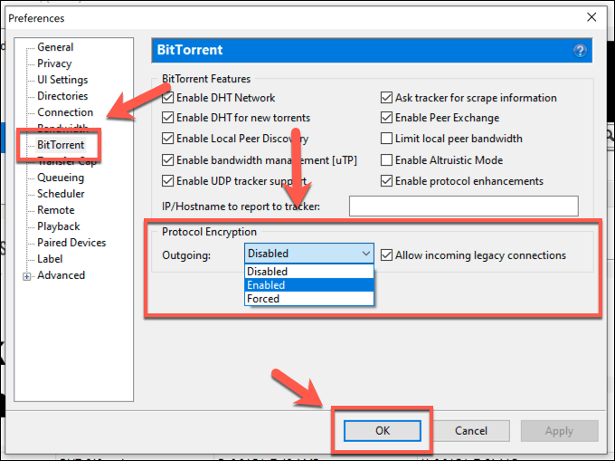 To get around this problem, you can hide your BitTorrent traffic using uTorrent’s BitTorrent protocol encryption. Technically, uTorrent doesn’t encrypt the traffic, but it will help to bypass the kind of traffic shaping that ISPs use to automatically disrupt BitTorrent file sharing—the kind of problem that stops uTorrent connecting to peers.