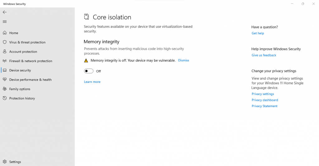 - Turn off Memory integrity by flipping the toggle to the Off position.