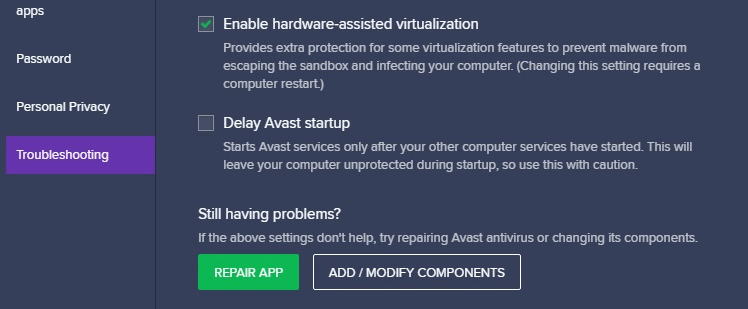 You have to look at the settings of your antivirus app for anything related to hardware virtualization and make sure to allow it. In Avast, you need to check General > Troubleshooting > Enable hardware-assisted virtualization.