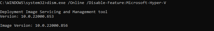 - To be extra safe, follow up with this command as well: dism.exe /Online /Disable-Feature:Microsoft-Hyper-V