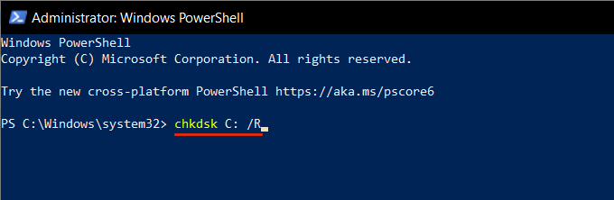 Windows 10 can also run into BSOD-related issues due to disk errors. You can use the Check Disk (CHKDSK) utility to scan for and repair them. To do that, open an elevated Windows PowerShell console and execute the following command: