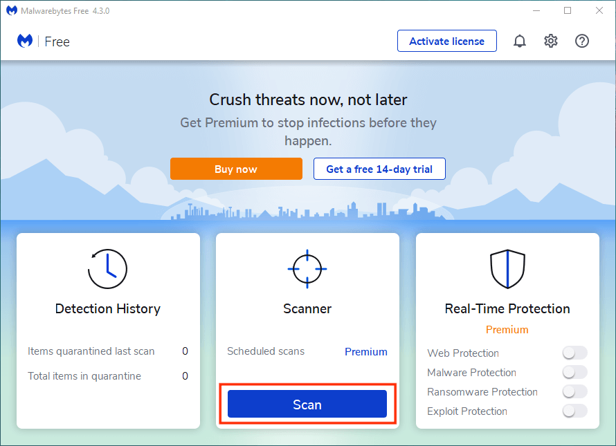 Once you’ve finished downloading and installing Malwarebytes, you can perform a quick scan of vulnerable system-related areas by selecting Scan. You can then do a deeper scan by selecting Scanner > Advanced scanner > Configure scan > Scan.