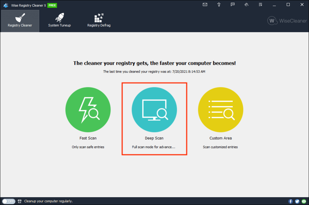 A corrupt or broken system registry often results in serious issues. You can fix that using the free version of Wise Registry Cleaner. After downloading and installing the program, open it and select Deep Scan to scan for and resolve registry-related issues.