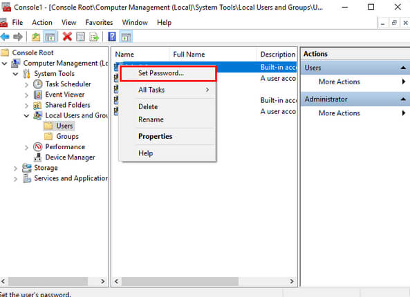 - Right-click the Administrators option again but this time select the Set Password… option.
