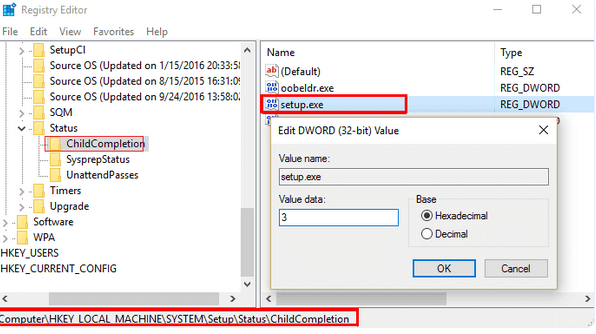 | HKEY_LOCAL_MACHINE\SYSTEM\Setup\Status\ChildCompletion\setup.exe | Value: 3 |