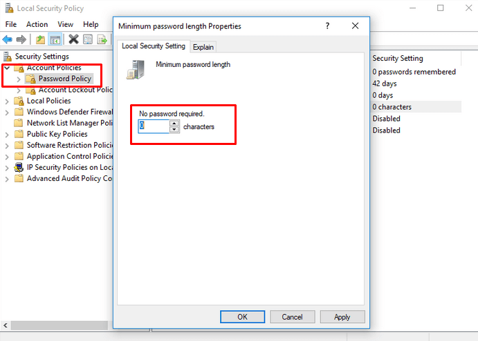 - When the popup window opens, expand the Account Policy in the left pane, and select Password Policy. * In the Local Security Setting tab set the minimum password length to 0 and press OK to continue.