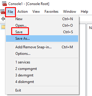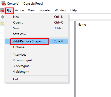 - When the Console opens up, click File in the menu bar. * Select Add/Remove Snap-in… from the drop-down menu.