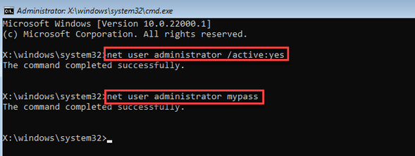 - Now type the next command: net user administrator mypass and press Enter on your keyboard.