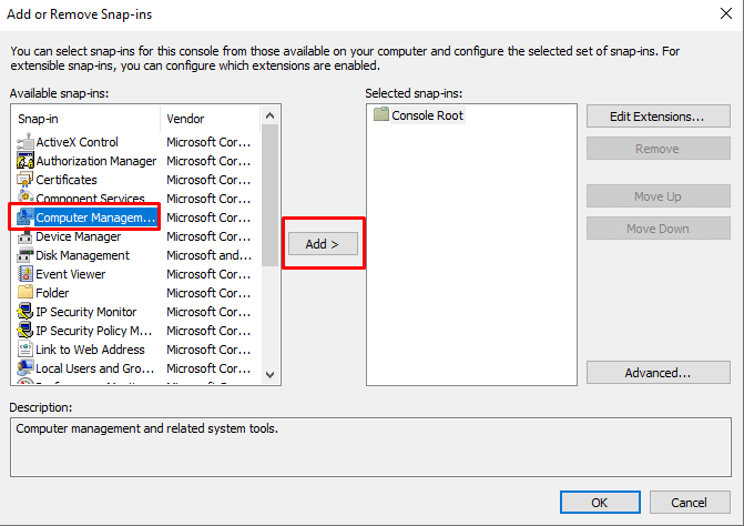 - Now select Computer Management from the left pane menu, and select the Add > button in the middle of the window.