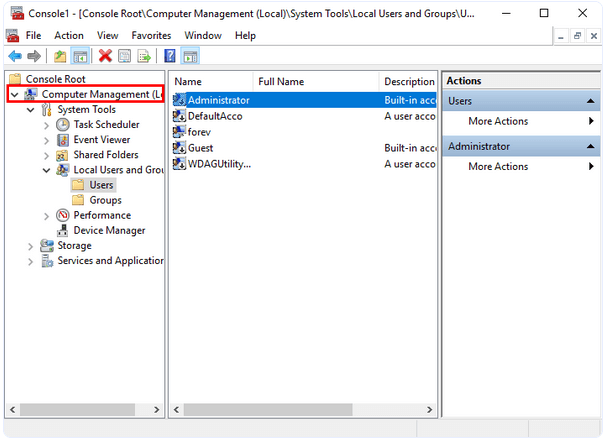 - Expand the System Tools > Local Users and Groups > Users in the left pane.