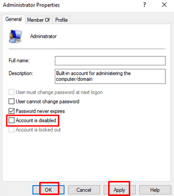 - This will list all users and groups on the console. * Right-click the Administrators and select Properties from the menu. * When the properties window opens, uncheck the Account is disabled box. * Click Apply and then the OK button to apply the changes.