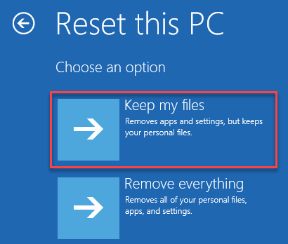 - In the Reset This PC screen select Keep my files.