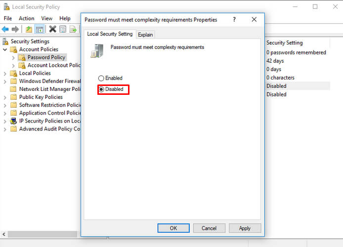 - In the next popup window select Disabled to disable the “Password must meet complexity requirements”, and select the OK button.