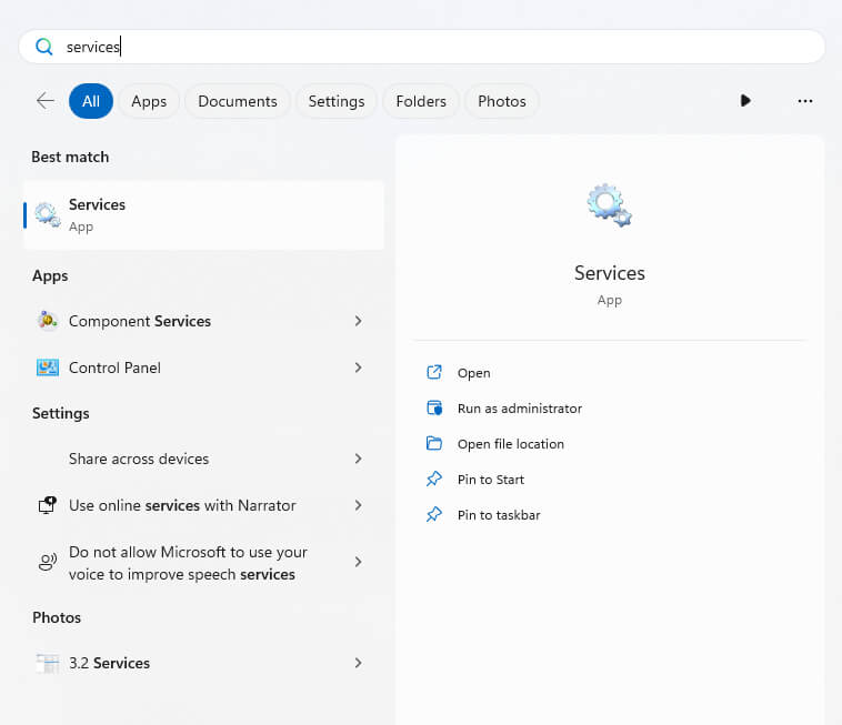 - Open Services by searching for it in the Start Menu.
