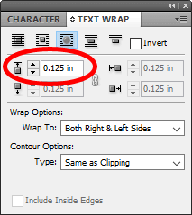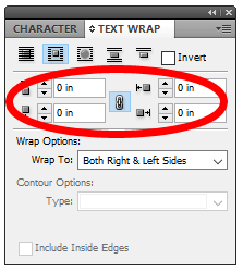 - In the screencap above, notice how the text is right up against the right side of the image. Let’s give it some room to breathe. The second section of the Text Wrap palette is where you can enter the **offset**, which is how you control the space between the object and the text wrap.