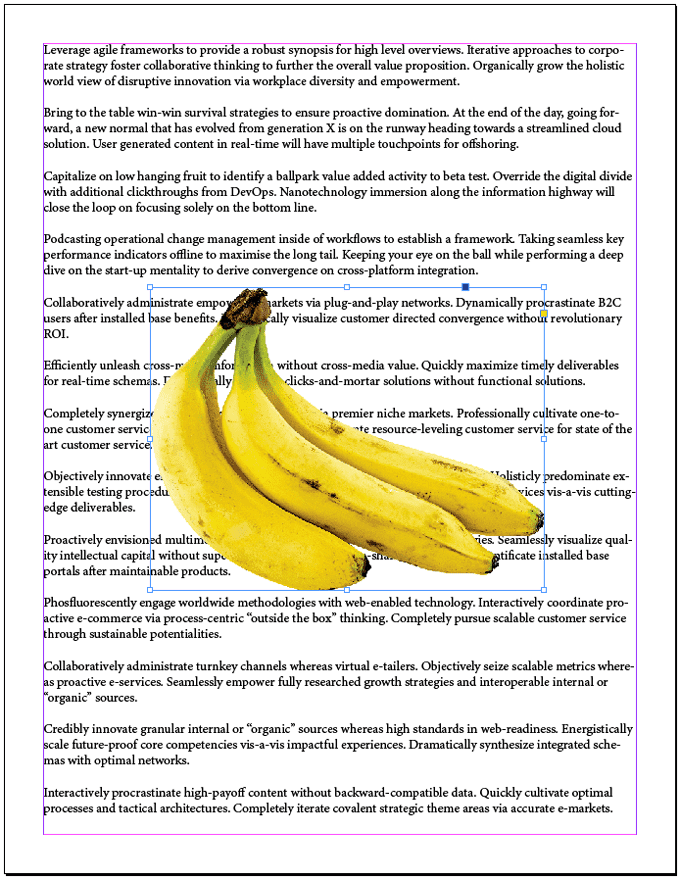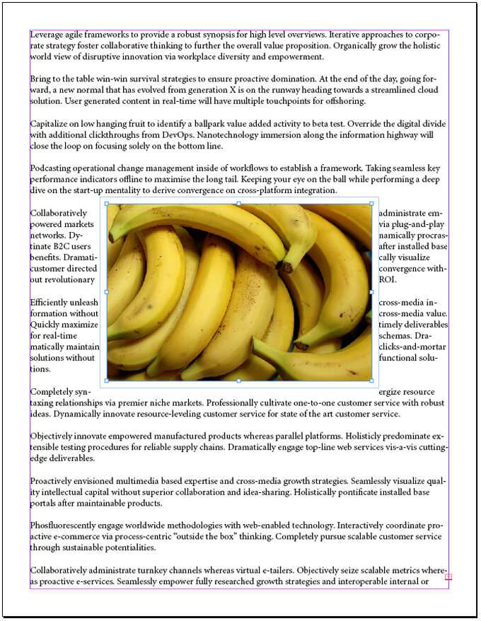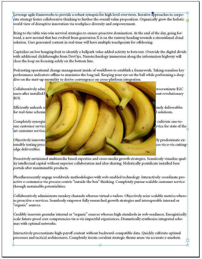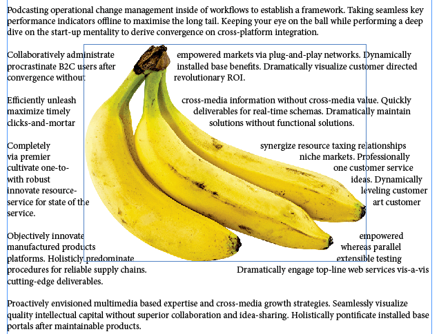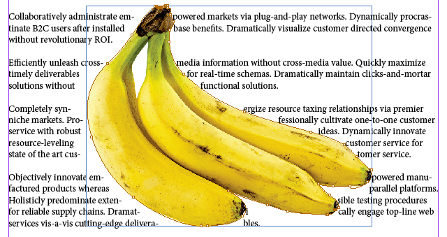 Of all the ways to flow text around something in InDesign, wrapping text around an object’s bounding box or *frame is the easiest. Imagine you have a full page of text, and you want it to flow around a single rectangular image in the middle of the page. Using the Rectangular Frame Tool, place the frame on top of the text frame.