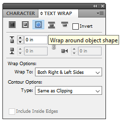 - If you want text to appear in empty spaces inside the edges of your image, check the box marked **Include Inside Edges**. * Press **OK**. * Through the steps above, we’ve created a path around the shape of the image. Now let’s wrap the text around that shape. First, display the Text Wrap palette (**Window **>** Text Wrap **or **Alt **+ **Ctrl **+ **W**). * With the image frame selected, select the **Wrap around object shape** button in the Text Wrap palette.