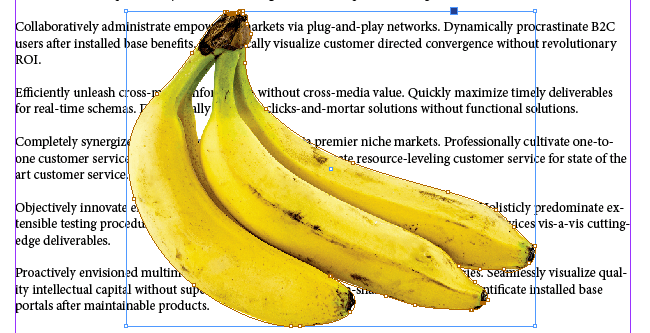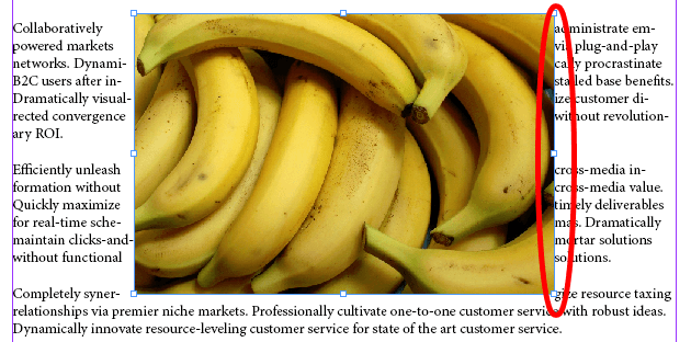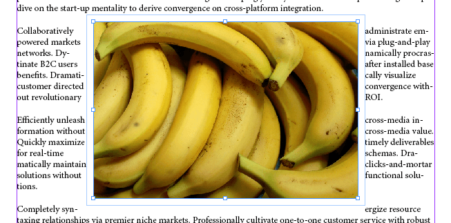 - Display the Text Wrap palette by selecting **Window **>** Text Wrap **or press **Alt **+ **Ctrl **+ **W** to toggle the palette on. * With the image frame selected, select the second icon in the top row of the palette, **Wrap around bounding box**. That will cause the text to flow around the bounding box of your image. * Try dragging the image around to see how that affects the text flow.