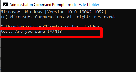- Use the /s flag with rmdir to force delete the folder along with subfolders and files in it. For example, if you want to remove a folder called “Test Folder”, enter rmdir /s test folder.