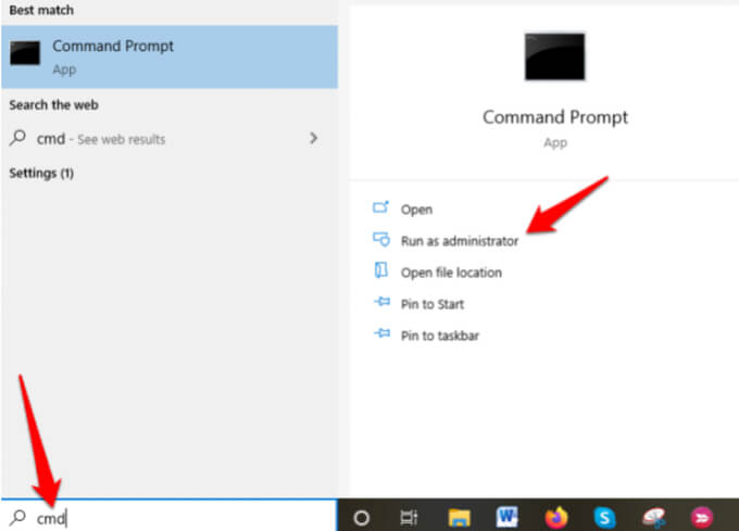 - Type CMD in the search box and select Run as administrator.