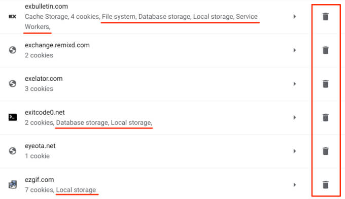 You should look out for sites with the following label: Local storage, Database Storage, File System, and Service Workers. Those websites store persistent cookies and other data locally on your Chromebook.