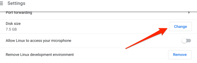 Google recommends allotting at least 7.5GB for the Linux development area. But if you barely install or use Linux applications, you can free up space on your Chromebook by reducing the Linux storage. Select Linux storage in the Storage management page and tap the Change button next to Disk size.