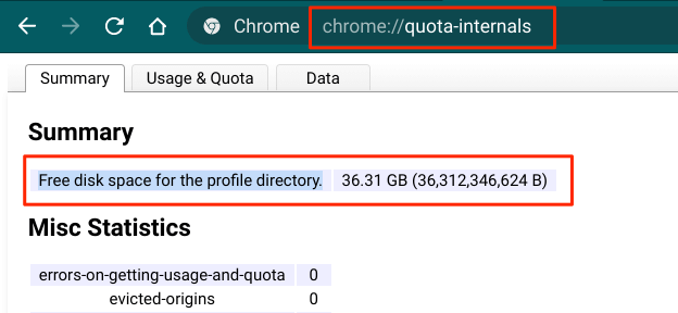 You can also check available storage space using Chrome. Type or paste chrome://quota-internals in the address bar and press Enter. In the Summary tab, the “Free disk space for the profile directory” is your Chromebook’s available storage.