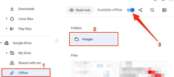 Open the Files app, expand the Google Drive category, and select the Offline folder. Afterward, select the folders or files and toggle off the Available offline switch on the menu bar.