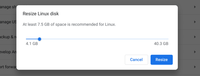 Move the slider to the left to reduce the Linux disk size to your preference (you can’t go below 4.1GB) and tap Resize.