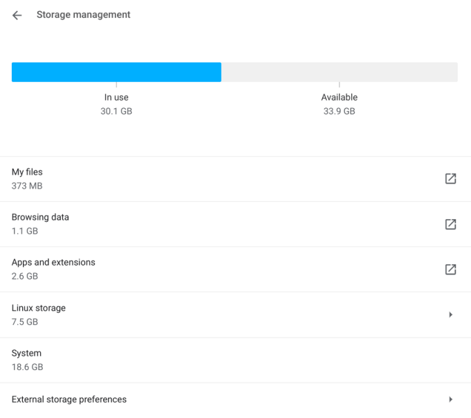 **Linux storage: **This is the disk space allotted to the installation and running of Linux apps. You’ll find this option in the storage management menu if you have, at any point, set up the Linux development environment on your Chromebook.