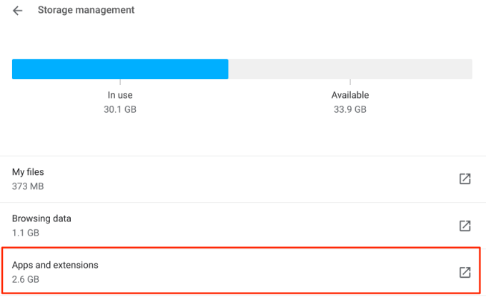Applications create user data, cache data, and other junk files that eat up storage space. Keeping several apps that you don’t use can cause your Chromebook to quickly run low on disk space. Uninstall unneeded apps to free up storage. Head to the Chrome OS Storage management menu and select Apps and extensions.