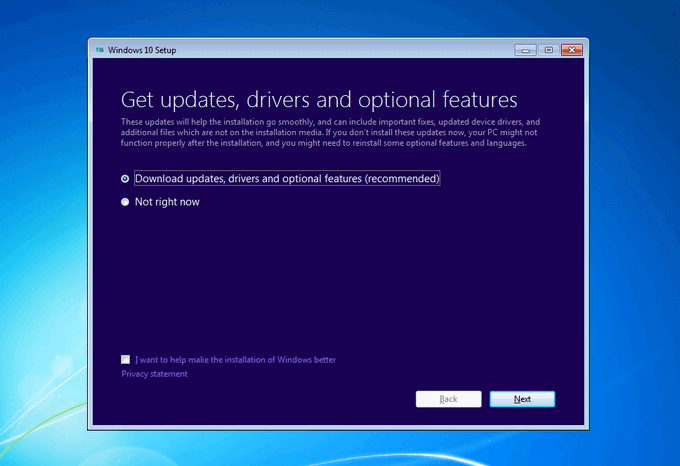 Windows will walk you through the installation process. The first recommendation is to download drivers, updates, and other optional features. You should accept these options to help ensure a successful upgrade.