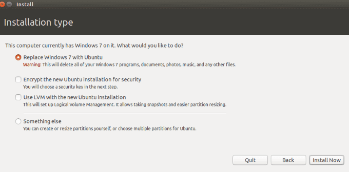 Choose to replace Windows 7 with Linux, but remember that all your apps and files will be erased. As mentioned above, before doing anything, back up your system first.