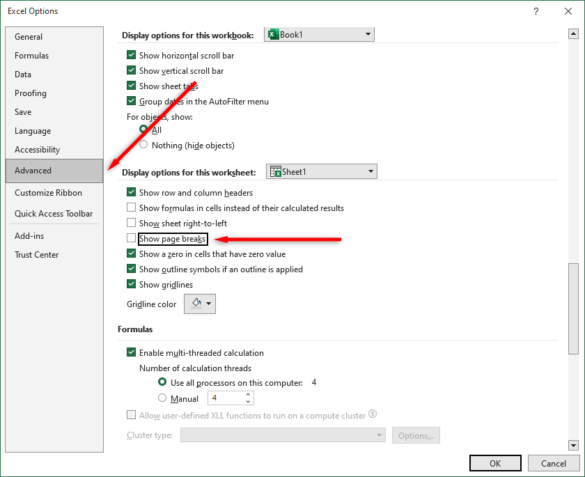 - In the Excel Options dialog box, select Advanced from the left-hand menu. * Scroll down to “Display options for this worksheet” and uncheck Show page breaks.