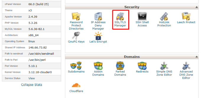 Log into your web hosting account and open the cPanel. Under Security, select the SSL/TLS Manager.
