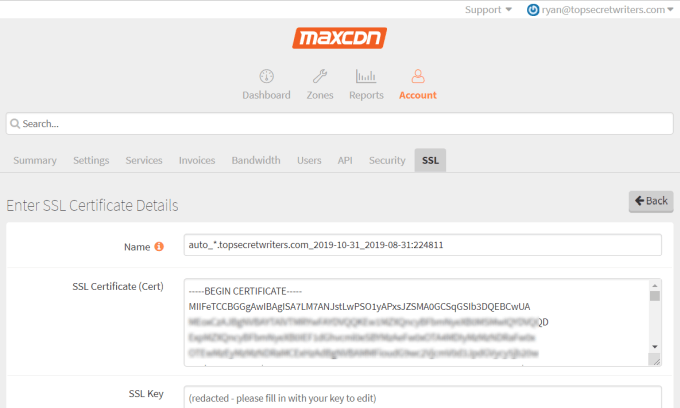 To fix this, you’ll need to log into your CDN account, access SSL settings, and add a new SSL entry. You can paste the same certificate, key, and CA bundle in those fields.