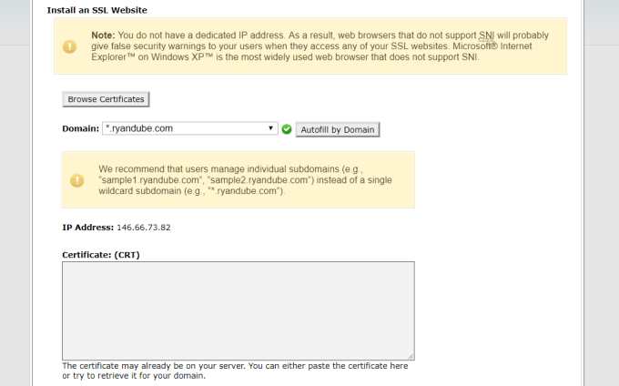 To purchase the SSL certificate, you’ll need the name of your domain, and the dedicated IP address of the web server that you noted above.