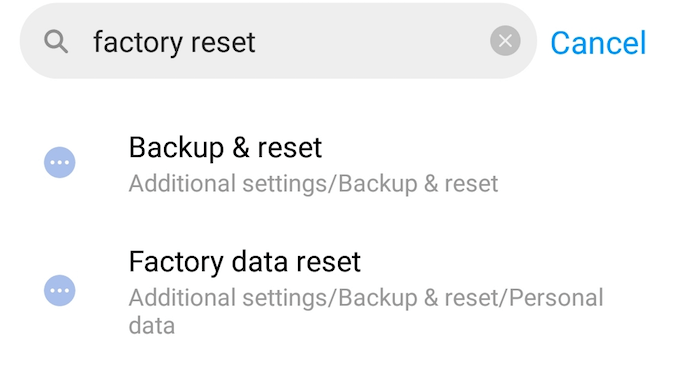 If you can’t find this option, just type “factory reset” in the search tool. Then choose **Backup & reset**.