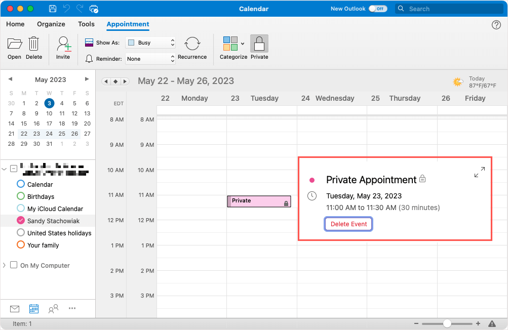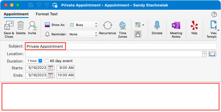 When someone views your private event on a shared calendar, they’ll see “Private Appointment” as the name and no details.