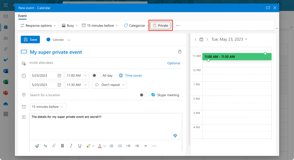 In the event details window, select Private in the toolbar at the top. Complete the appointment or meeting details and select Save as normal. If you’ve already saved the event, simply open it, mark Private, and then save it once more.