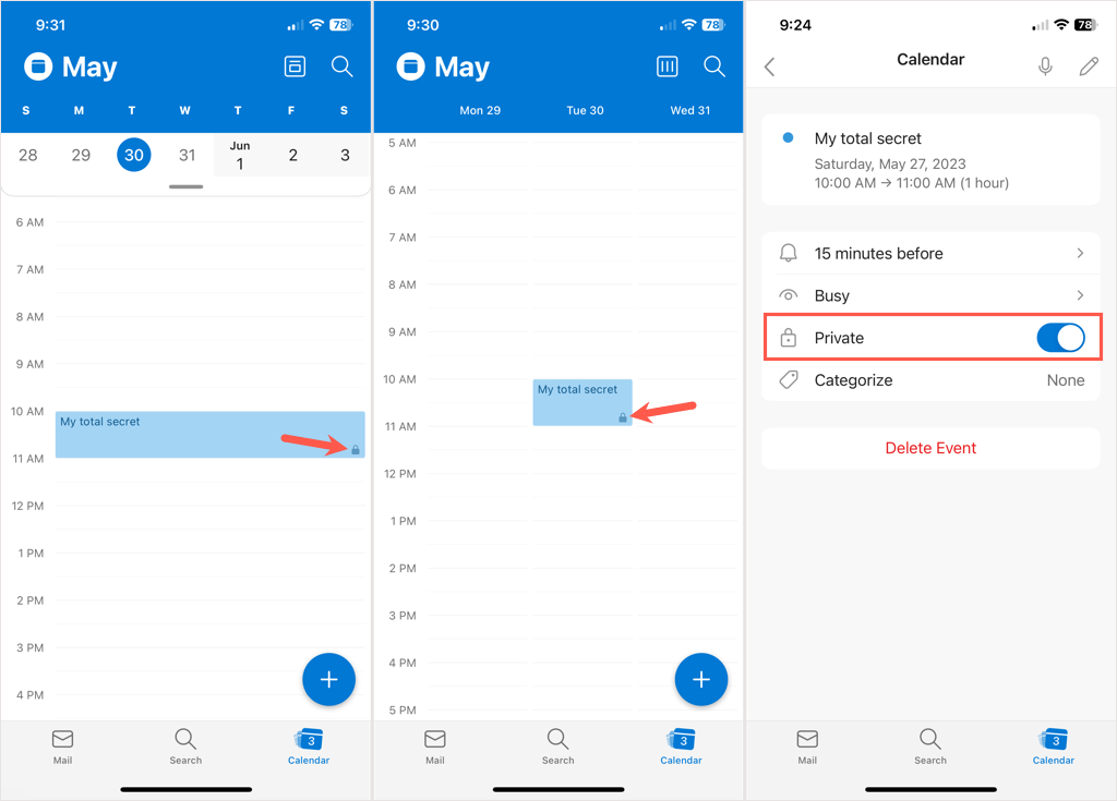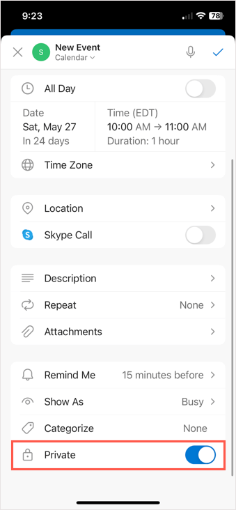 The Outlook mobile app on Android and iPhone offers the same private feature for your events.