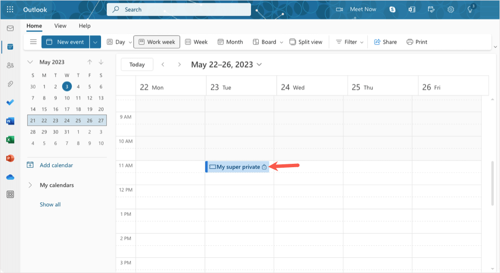 You’ll then see the Private icon on the event in Outlook Calendar.