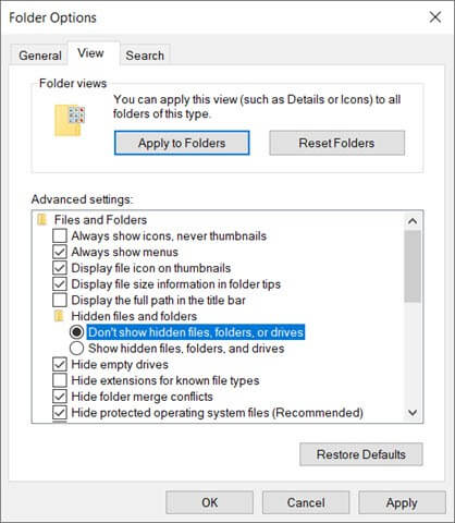- Select the View tab. Go to Advanced Settings and Hidden files and folders. Select Don’t show hidden files, folders, or drives.