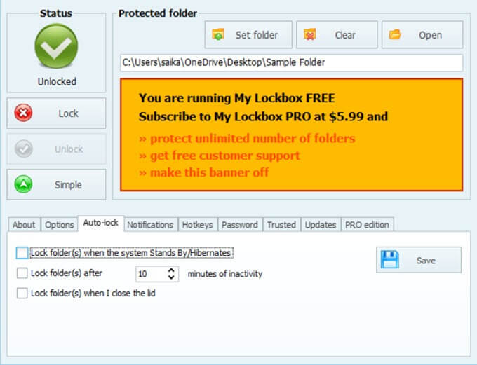 - Auto-lock feature which locks a folder after a preset interval or when the laptop lid is closed.