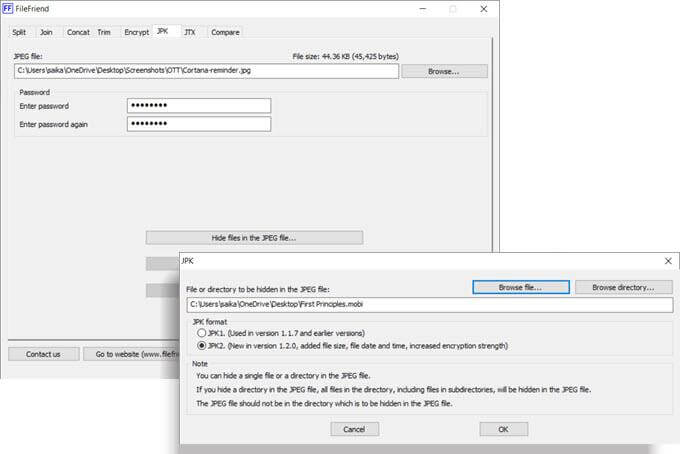 FileFriend is a freeware app that is just a 285 KB download. This uncomplicated app gives you a few different tools to work with. To hide a file, use the JPK tab.First, choose the host JPG file. Then choose the directory or file you want to hide within it.