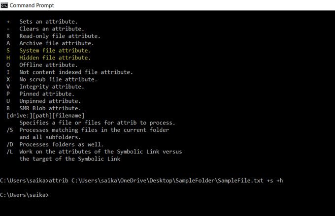 You can also hide an entire folder using the attrib command. Just replace the path and the folder name with your own. attrib C:UserssaikaOneDriveDesktopSampleFolder +s +h