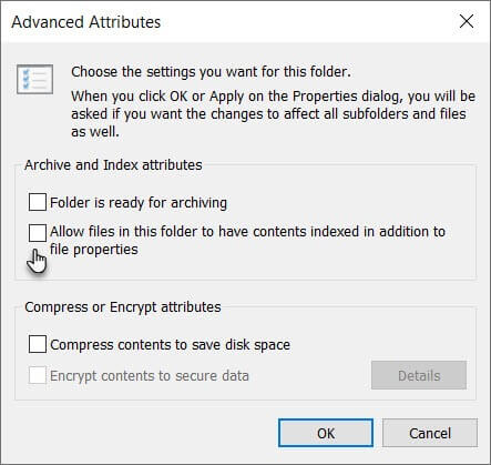 - These files and folders can still show up in a Windows search. To prevent this, select **Advanced**. * Uncheck the boxes under the **Archive and Index attribute**s section of the Advanced Attributes dialog box. Select **OK** to exit.