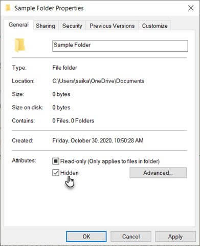 - On the General tab of the Properties dialog box, check the Hidden box in the Attributes section.
