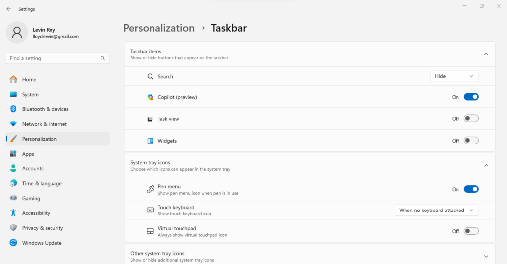 The personalization setting is also where you can re-enable Copilot if you do not see it on your Taskbar. However, keep in mind that it only shows up if you have installed the required Windows update – if you do not see the setting at all, you cannot enable Copilot.
