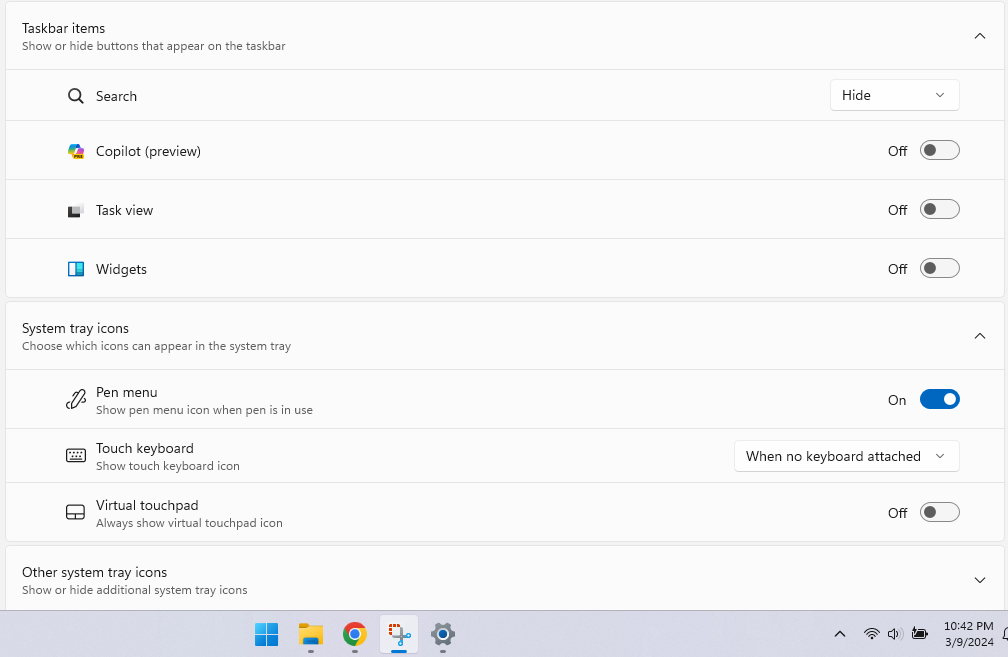 Just like the Chat app, there is really only one way to remove Copilot from the taskbar – the personalization settings. Since the right-click context menu does not appear for this icon, that method is not available.